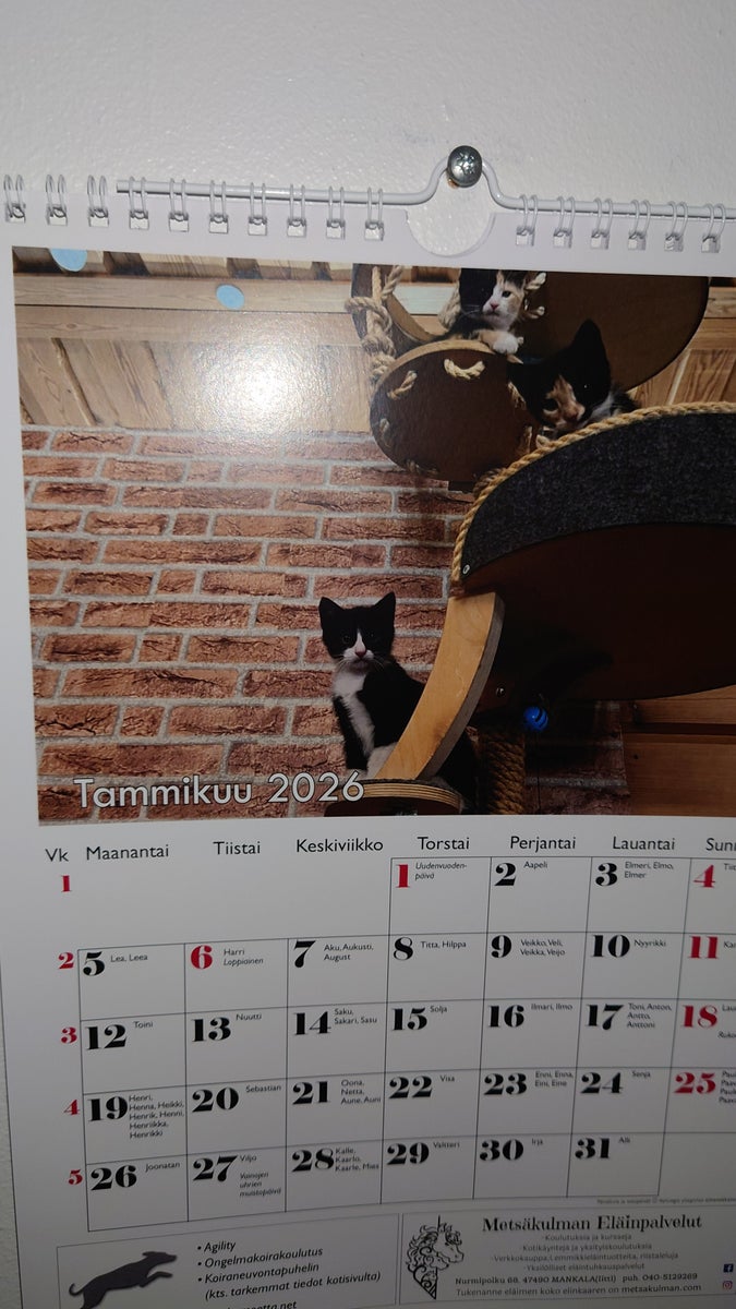 Kouvolan Seudun Eläinsuojeluyhdistyksen seinäkalenteri vuodelle 2026. Kaikki kalenterin tuotot menevät eläinsuojeluyhdistyksen kodittomien eläinten hyväksi.